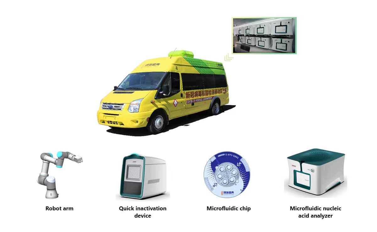A state-of-the-art diagnostic van can test up to 2,000 people a day, return results within 45 minutes with a very high sensitivity( limit of detection of 150 copies/mL), and reduces contact risks.