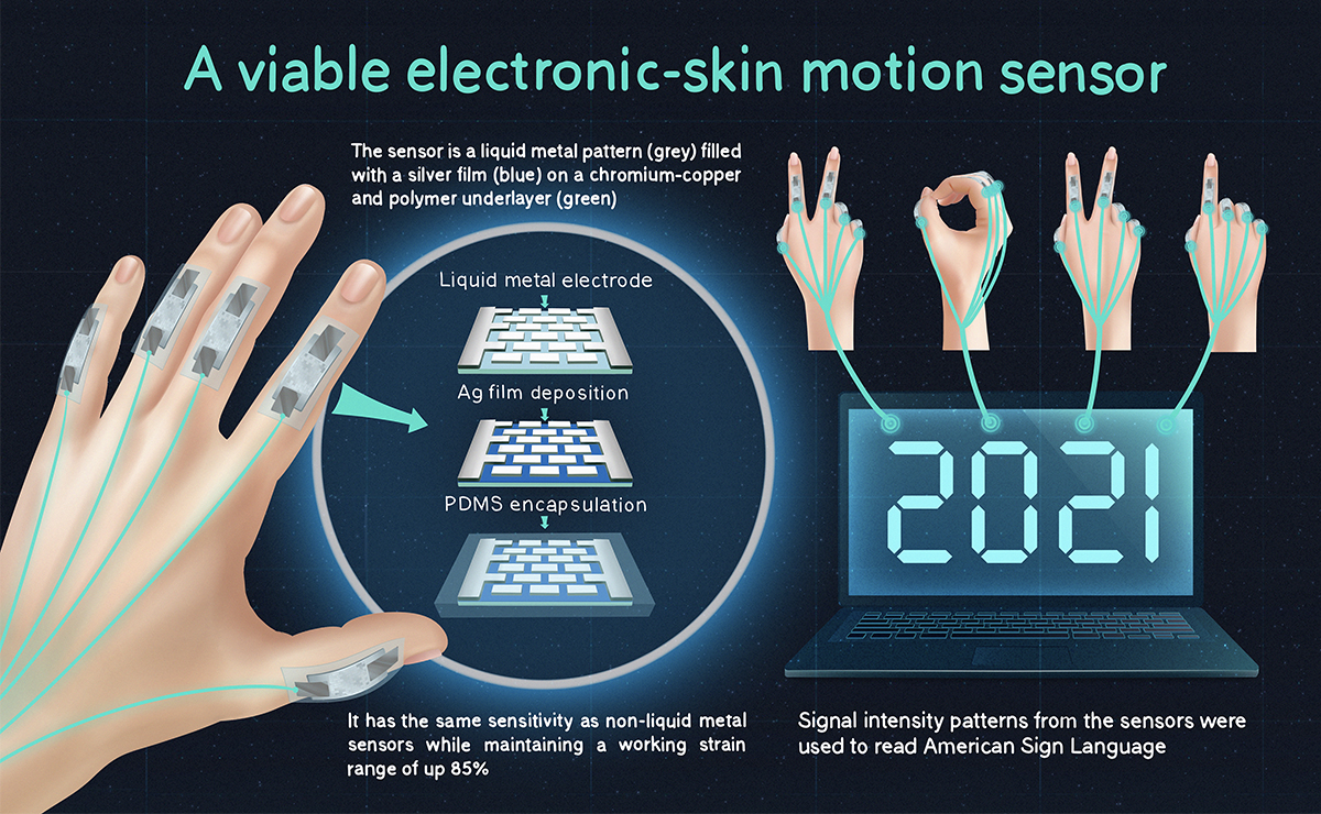 “We improved the sensitivity of liquid metal-based strain sensors by two orders of magnitude while maintaining a wide (>85% strain) working range,” explains Liu. The team tested their device by accurately interpreting sign language in English and Chinese, by sensing finger motions. It’s the first time, to Liu’s knowledge, that a sensor based on a liquid metal or a liquid metal composite has achieved comparable sensitivity as other state-of-the-art sensors.