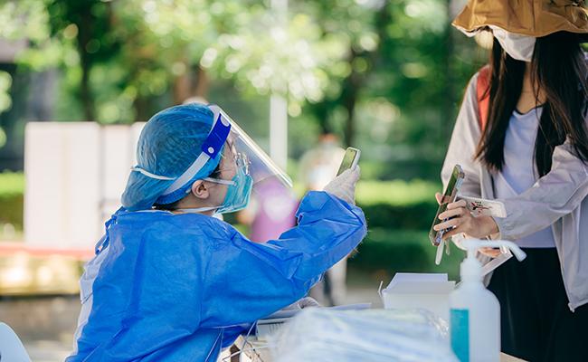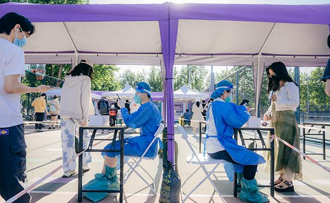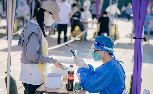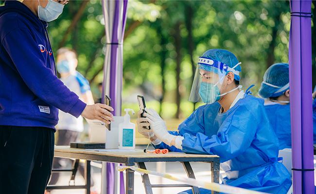 Volunteers register the personal information of the students taking nucleic acid tests. [Photo/Zhang Jiaqi]