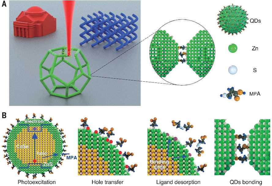 To reveal the underlying mechanism, Liu and Hou (the lead authors of this work) have conducted a series of controlled experiments and confirmed that the high-energy carriers, through photoexcitation, play a significant role in initiating the printing process. Under photoexcitation, the holes excited inside quantum dots are transferred to the nanocrystal surface and improve their chemical reactivity, leading to interparticle chemical bonding (Fig. 1).