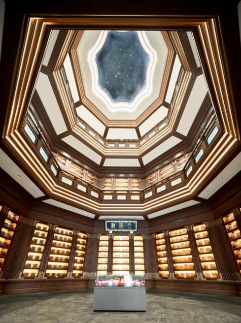 A themed exhibition occupies the first three floors of Wenhan Pavilion. At the top is the octagonal caisson ceiling that draws on the pattern of the flower stem of persimmon fruits. It presents the magnificent scene of the vast galaxy, to imply the profoundness of Chinese civilization.