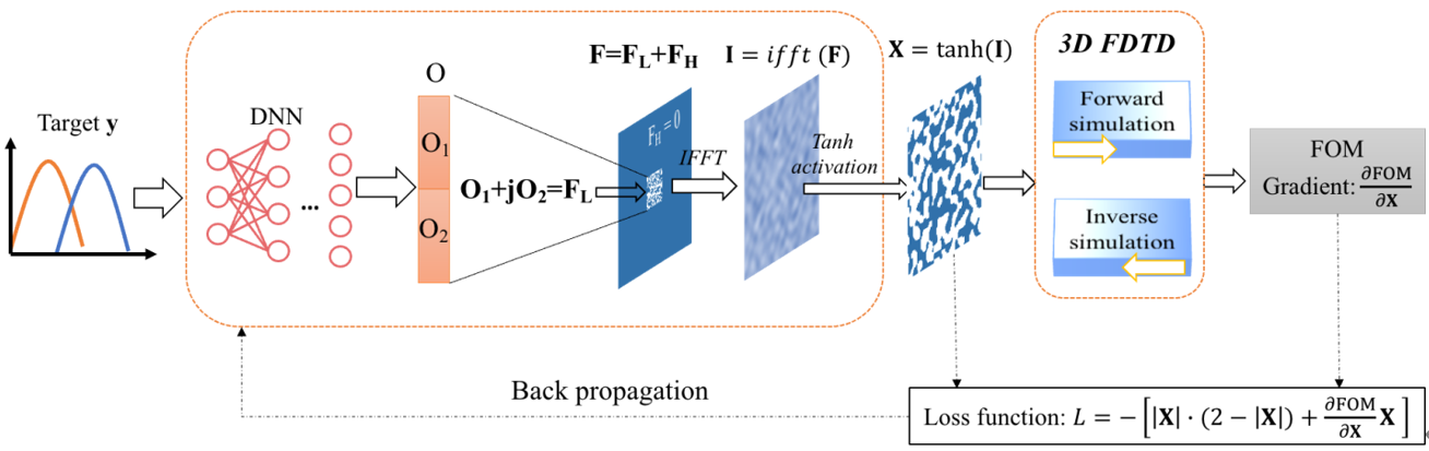 To achieve multi-task device optimization design, the research team mapped the design objective to low-frequency Fourier components through a deep generative neural network. These components can be restored to the specific structure of the device graph by Fourier inverse transformation after high-frequency padding. The generated device structure is then simulated by electromagnetic simulation software to obtain the actual optical response, and the difference between the simulated response and the target optical response can be used to train the generative neural network.