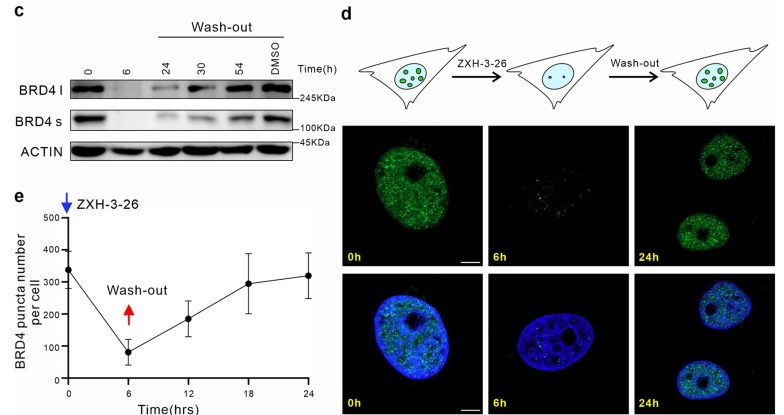 Subsequently, the researchers further explored the potential of using PROTAC for LLPS research by utilizing its reversibility. Interestingly, through wash-out experiments, they found that 24 hours after BRD4-PROTACs were removed, the number of endogenous BRD4 condensates had almost returned to the original levels, while at this time, the protein level of BRD4 had just begun to show signs of recovery (Figure 2). This suggests that the recovery of BRD4-related condensates may occur prior to the recovery of BRD4 protein levels, which is a phenomenon discovered for the first time in the application of PROTAC in LLPS research.