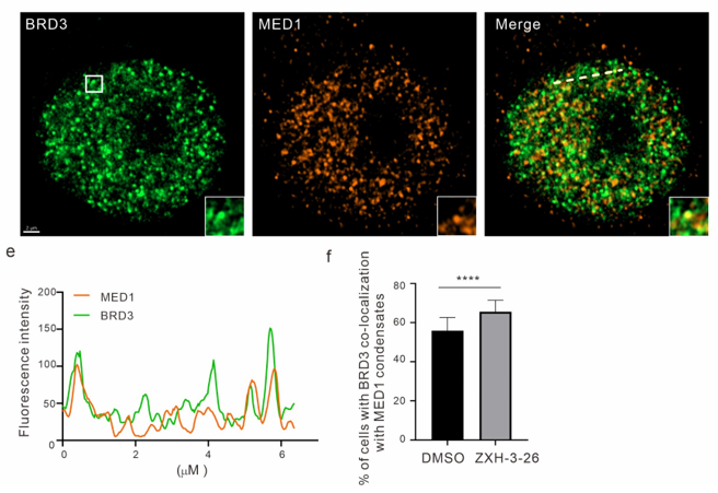 Through the combined use of PROTAC, immunofluorescence staining, quantitative calculations and other technologies, researchers have established a "PROTAC-target protein-LLPS" research method targeted at intracellular BRD4 condensates. The researchers used 100 nM of ZXH-3-26 to determine the endogenous BRD4 degradation kinetics in HeLa cells. They found that the PROTAC molecule targeting BRD4 (ZXH-3-26) could rapidly degrade BRD4 and its condensates at low concentrations and short times (Figure 1). After 30 minutes of BRD4-PROTACs treatment, a significant decrease in BRD4 protein levels was observed, and after 4 hours, BRD4 protein was completely degraded, while the amount of BRD4 condensates also decreased sharply. This indicates that PROTAC can serve as a tool for rapid perturbation of condensate components.