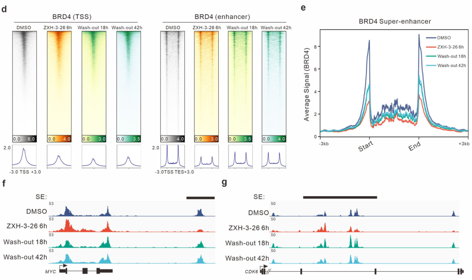 To explore the interesting phenomenon, the researchers further carried out multi-omics analysis to study its possible physiological and functional significance. Gene expression profiles of control groups, BRD4-PROTACs treated for 6 hours, wash-out for 18 hours, and wash-out for 42 hours were explored through RNA-seq and Cut&Tag-seq, as well as the enrichment changes of BRD4 in TSS regions, enhancer regions, and super-enhancer regions. The data showed that the gene expression profile of the wash-out 42-hour group had already recovered to a level similar to that of the control group. More surprisingly, as the degrader was removed, BRD4 quickly rebounded and preferred to occupy the super-enhancer regions, especially the super-enhancer regions of some key cancer genes and cell cycle genes (Figure 3). This result shows that PROTAC can be a powerful tool for studying the physiological and pathological functions of biomolecular condensates, and its rapid and reversible degradation is a key advantage as an LLPS research tool.
