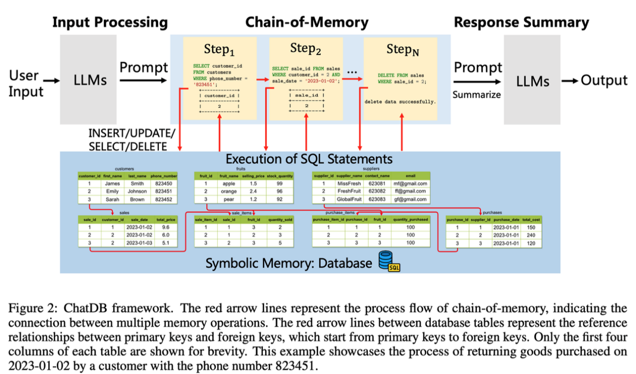 The ChatDB framework consists of three main stages: input processing, chain-of-memory, and response summary. In the “input processing”, ChatGPT generates a series of intermediate steps to manipulate the symbolic memory by LLMs based on users’ input. When it comes to the “chain of memory”, ChatDB manipulates the symbolic memory in sequence according to a series of previously generated SQL statements, including operations such as insert, update, select, delete, etc. In the last step, ChatDB summarizes the final response to the user based on the results of a series of chain-of-memory steps.