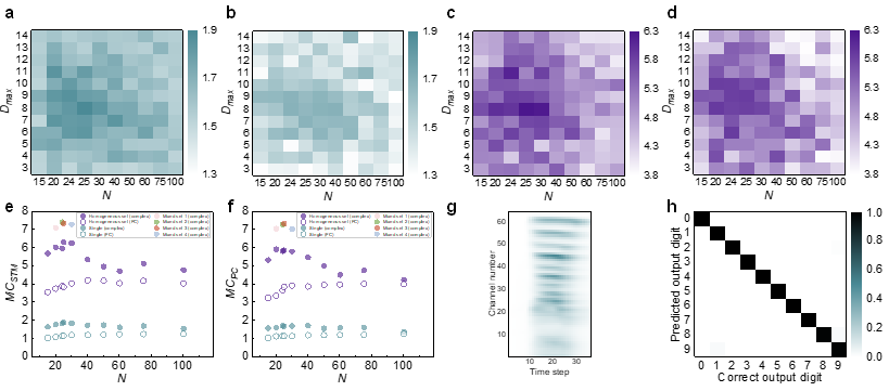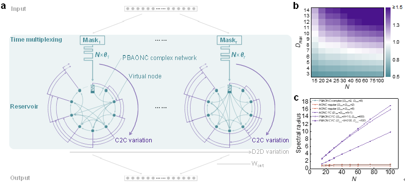 This method utilizes the inherent C2C variability in the resistance decay of dynamic memristors to generate complex network connectivity patterns. The generated PBAONC complex network exhibits a certain degree of small-world characteristics, which are commonly observed in biological systems (such as the brain), the Internet, and social networks. This achieves a better balance between information integration and differentiation. The work demonstrates the advantages of memristor-based PBAONC complex networks in brain-inspired reservoir computing tasks. Experimental results show that the reservoir network based on the PBAONC topology has a superior spectral radius, as shown in Fig. 3. The memory capacity of the memristor complex network reservoir is increased by 209.8% compared to traditional memristor fully connected reservoir networks, and it exhibits better performance in speech recognition tasks, as shown in Fig. 4.