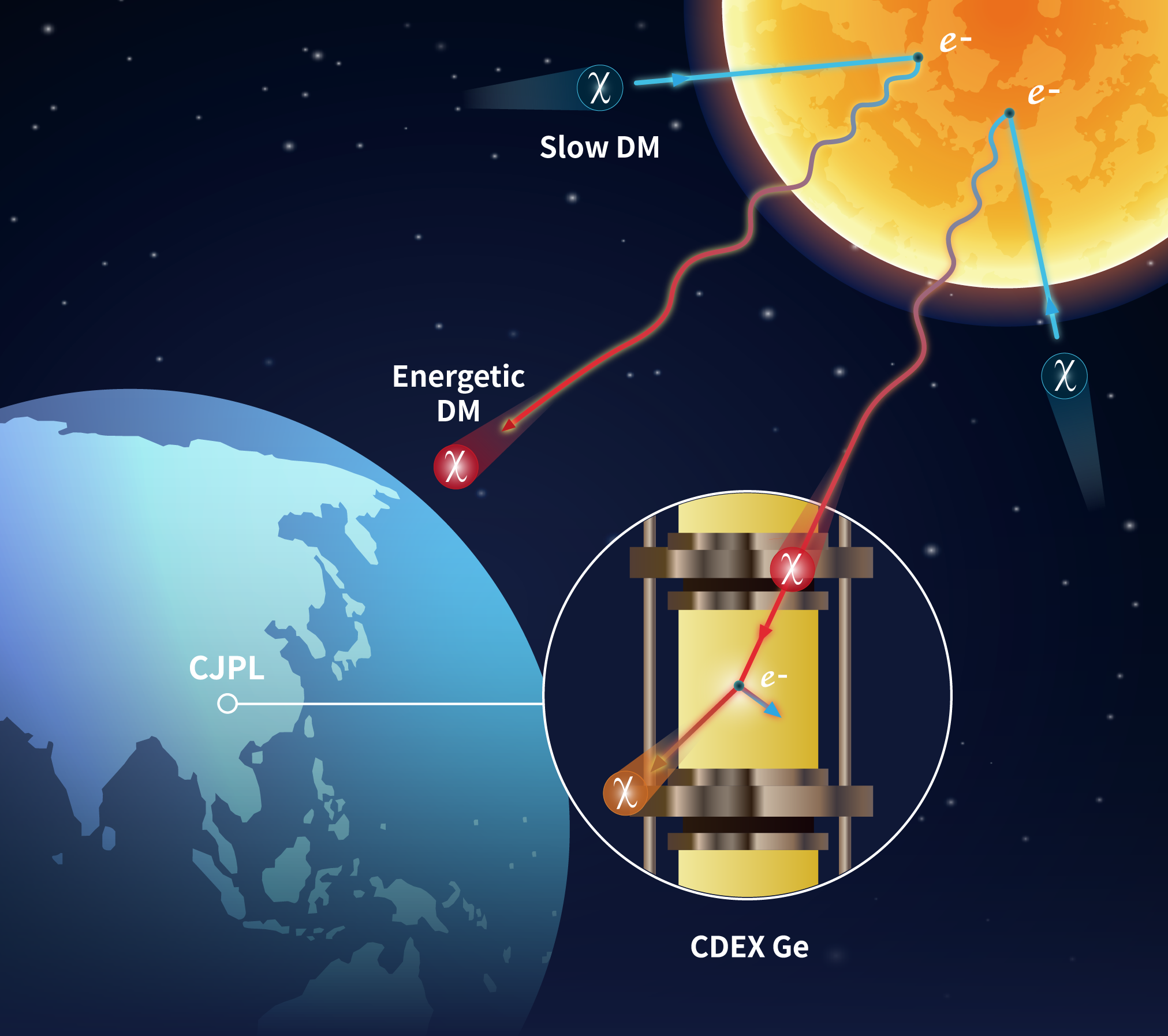 Fig. 1 The mechanism of SRDM. Dark matter particles enter the Sun and get accelerated by high-energy electrons. Accelerated DM particles are reflected to the Earth and detected by HPGe detectors.