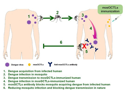 Dr. Gong Cheng, a Principal Investigator from Tsinghua School of Medicine, China, and his colleagues developed a vector-based vaccination strategy against dengue dissemination. In this study, Cheng’s group identified multiple C-type lectins (mosGCTL) as necessary susceptibility factors to facilitate dengue virus infection in mosquito Aedes aegypti. These mosGCTLs directly interacted with dengue virus. For arthropod-borne microbes, vector ligands that interact with pathogens are potential targets for interfering with the successful acquisition of the microbe from the vertebrate host. The combination of antisera against multiple mosGCTLs efficiently reduced DENV-2 infection after a blood meal, suggesting that it is feasible to develop a mosGCTL-based transmission-blocking vaccine to interrupt the life cycle of dengue virus and control disease burden in nature (See the picture).