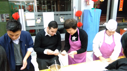 Art performance, lucky draws, and games made the reception warm, interactive, and full of enthusiasm and happiness. Most exciting and attractive to the international students is the demonstration of dumpling making by Prof. Chen Xu and other faculty and staff. Several international students were encouraged to practice it under supervision, and they were all very happy with their success.