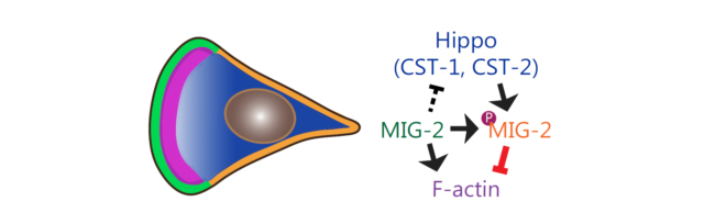 Prof. Ou and his colleagues found that C. elegans Hippo kinases promote cell migration along the anterior–posterior body axis by inhibiting the dorsal–ventral (DV) migration. Ectopic DV polarization was also demonstrated in gain-of-function mutant animals for C. elegans RhoG MIG-2. They identified serine 139 of MIG-2 as a novel conserved Hippo kinase phosphorylation site and demonstrated that purified Hippo kinases directly phosphorylate MIG-2S139. Live imaging analysis of genome-edited animals indicates that MIG-2S139 phosphorylation impedes actin assembly in migrating cells. Intriguingly, Hippo kinases are excluded from the leading edge in wild-type cells, while MIG-2 loss induces uniform distribution of Hippo kinases. They provide evidence that Hippo kinases inhibit RhoG activity locally and are in turn restricted to the cell body by RhoG-mediated polarization.
