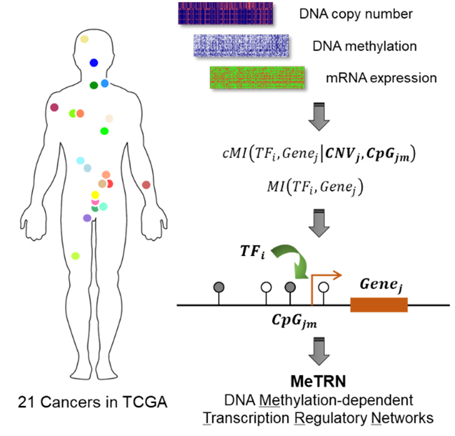 In a recently published paper by Cell Reports, Dr. Xuerui Yang’s group introduced an integrative analysis pipeline based on mutual information theory, to systematically find dependencies of transcriptional regulation circuits on promoter CpG methylation profiles. By taking advantages of the multi-omics tumor profiling data in The Cancer Genome Atlas (TCGA), their analyses generated a series of Cancer type-specific DNA Methylation-dependent Transcription Regulatory Networks (MeTRNs), for 21 major cancer types.
