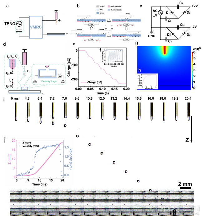 Fig. 2 Experiments of the triboelectric cell printing. (a). The electrical circuit of triboelectric cell printing. (b). The working principle of FRD-TENG. (c). The electrical circuit of the voltage multiplier rectifying circuit (VMRC). (d). The schematic of charge measurement of each microdroplet (e-f). The charge and current waveforms of the triboelectric cell printing process, respectively. (g-h). The simulation results of the potential distributions on the 2-D range and the Z-axis, respectively. (i). The dropping process of the microdroplet recorded by the high-speed camera (j). The displacement and velocity of one microdroplet recorded by the high-speed camera.