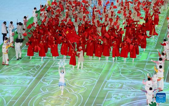 The Olympic delegation of the People's Republic of China march into the National Stadium during the opening ceremony of the Beijing 2022 Olympic Winter Games in Beijing, capital of China, Feb. 4, 2022. The teams were led by a placard bearer dressed in costumes with ice and snow patterns. The placard, designed by Li Min and Song Chen, is in the shape of a glowing snowflake and bears the names of each National/Regional Olympic Committee. [Photo/Xinhua]
