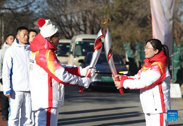 The torches, designed by Li Jianye, are used during the Beijing 2022 Olympic Torch Relay at the Olympic Forest Park in Beijing, capital of China, Feb. 2, 2022. [Photo/Xinhua]