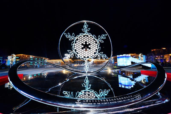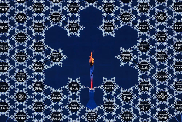 Small snowflakes with each country's team name, designed by Li Min and Song Chen, culminate in a giant snowflake installation that doubles as the Olympic flame cauldron. [Photo/Xinhua]