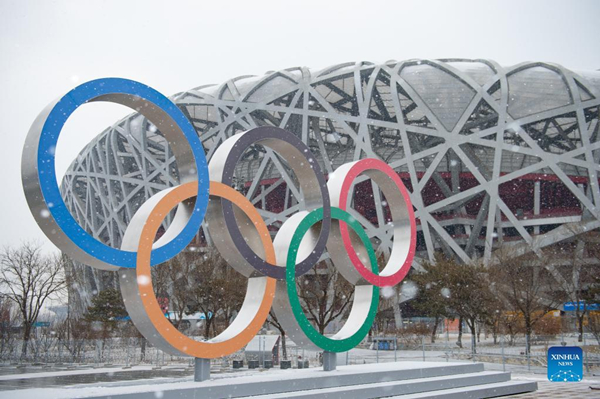 Photo taken on Jan. 20, 2022, shows the Olympic rings installation which was designed by Professor Du Yi's team as part of the larger city landscape designs, placed outside the National Stadium amid snowfall in Beijing, capital of China. [Photo/Xinhua]