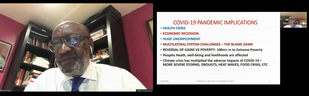 At 9pm Beijing time, a webinar with the theme of China-Africa Cooperation in Post-pandemic Era was held. It was presided over by Associate Professor Xie Zheping, Secretary General of CALDI. Guests at the meeting were: Lin Yi, Vice President of the Chinese People’s Association for Friendship with Foreign Countries and Executive Vice President of the African-Chinese People’s Friendship Association; Kuang Weilin, former Ambassador to the African Union and UN Economic Commission for Africa; Gu Zhiqiang, Director of Department of International Cooperation African Division (Foreign Aid Division) of the National Health Commission of the PRC; Shi Zhiqin, Professor at the School of Social Sciences of Tsinghua University and Executive Dean of the Academy of Belt and Road Initiative (ABRI) of Tsinghua University; Liu Huiqin, Executive Director of CALDI; Getachew Engida, Co-President of CALDI and former Deputy Director-General of UNESCO; and Shamil Jeppie, Professor at the Department of History of the University of Cape Town, South Africa.
