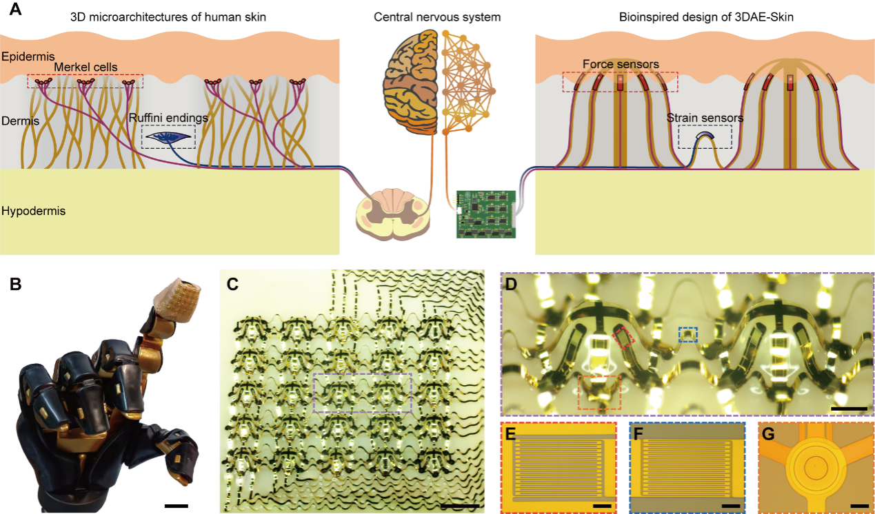 (A) Bio-inspired design of the 3D architected electronic skin (3DAE-skin). (B) 3DAE-skin attached to the finger tip of a robot hand. (C-G) Optical and microscope images of the 3DAE-skin.
