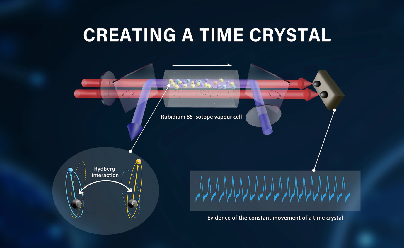You and his Tsinghua colleagues — working with researchers from the Beijing Academy of Quantum Information Sciences, in China, Aarhus University, in Denmark, and the Vienna University of Technology, in Austria — created their room temperature time crystal by coupling lasers to excite the electrons in a ‘cloud’ of rubidium-85 Rydberg atoms.