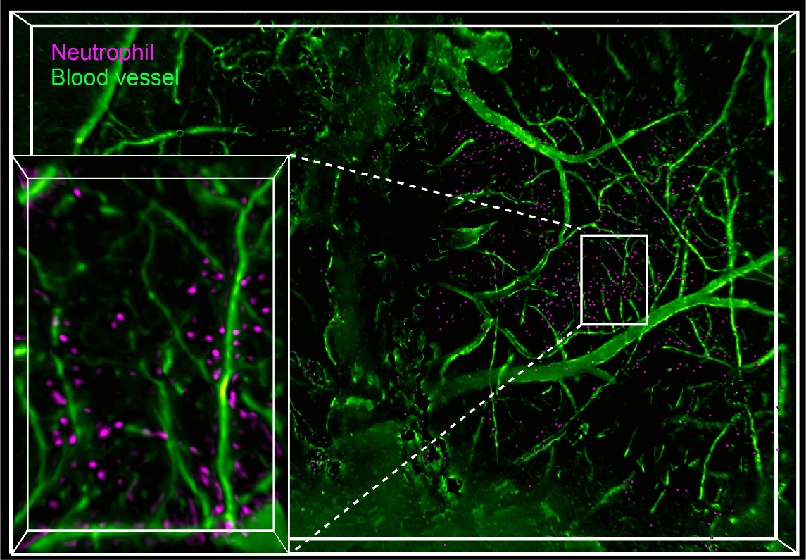 A new mesoscale microscope system developed at Tsinghua was able to capture in 3D detail an influx of cells, called large-scale meningeal neutrophils (magenta), from the peripheral immune system, in response to acute brain injury in mice models.