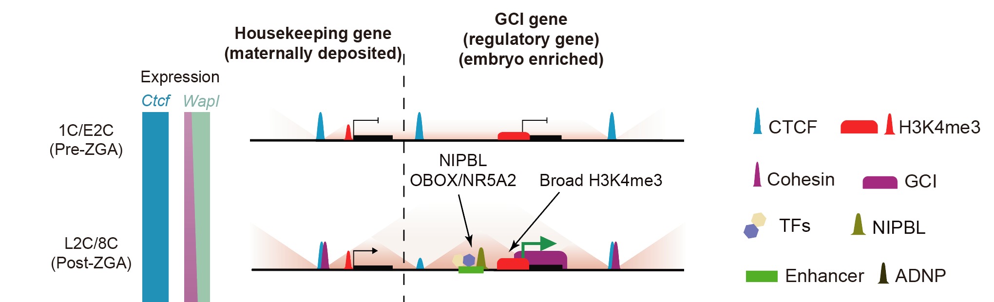 In contrast to the stable CTCF binding, another critical architectural complex, cohesin, showed very low binding levels at the 1-cell stage. This correlates with the low translation levels of cohesin components and its loader NIPBL, as well as the high expression of the unloader WAPL. The combination of weak loading and strong unloading of cohesin leads to insufficient cohesin-mediated loop extrusion. Increased expression of cohesin and NIPBL coupled with downregulation of WAPL facilitates the gradual restoration of TAD structures.