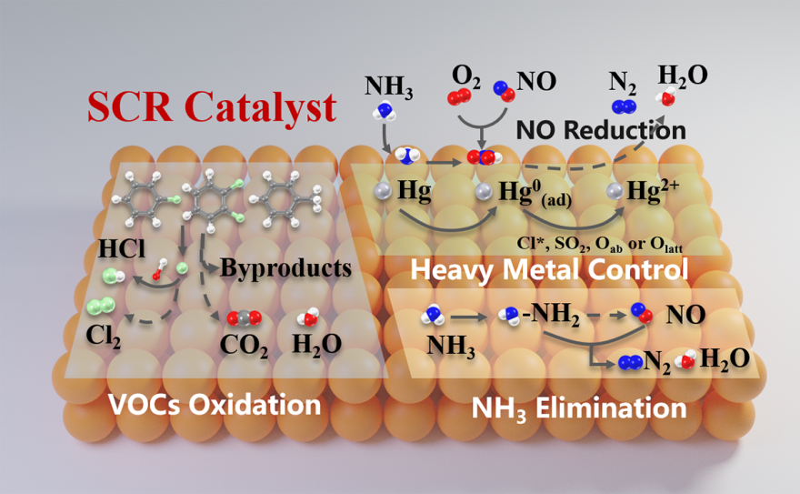 Redesigned novel catalysts from Li’s group can realize the simultaneous removal of nitrogen oxides with one or more other emissions, such as volatile organic compounds, heavy metals, and ammonia.(Credit: Reprinted with permission from authors. Copyright © 2021, American Chemical Society. https://doi.org/10.1021/acs.est.0c07326)