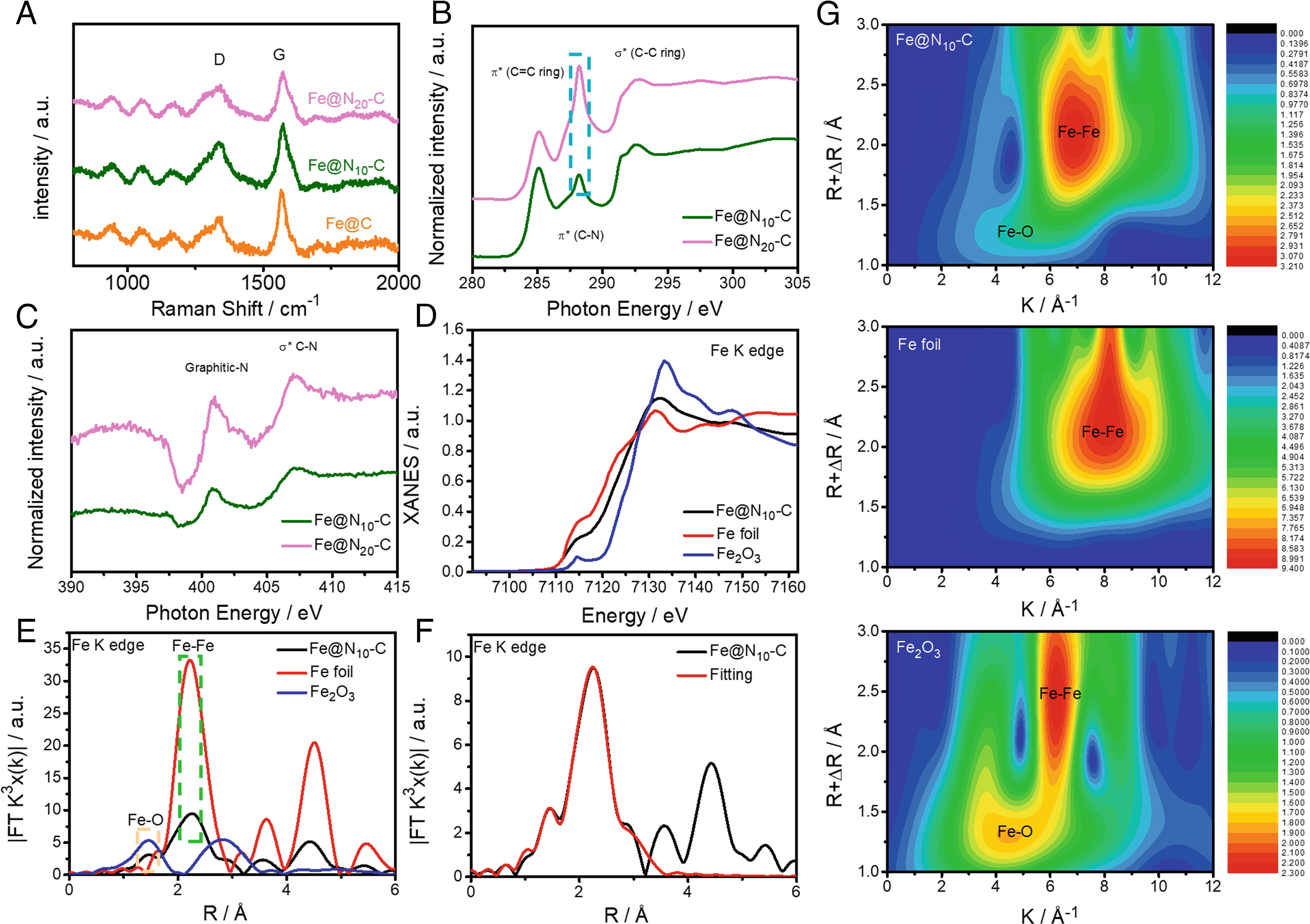 Next, we assessed the structure-property relationship of these catalysts, and extended X-ray absorption fine structure measurements were performed to investigate the valence states and coordination environments of the Fe, N, and C sites in Fe@Nx-C. This provides further evidence of the formation of N-doped C during the pyrolysis process. In addition, after pyrolysis treatment, the N specie in the Fe@Nx-C catalysts was mainly graphitic-N. Therefore, the dominant reactive sites for Fe@Nx-C can be postulated to be C active sites neighboring the N sites (CN). The enhanced activity of the Fe@N10-C catalyst can be attributed to the appropriate amount of N-dopant in the carbon layers surrounding the Fe NPs.