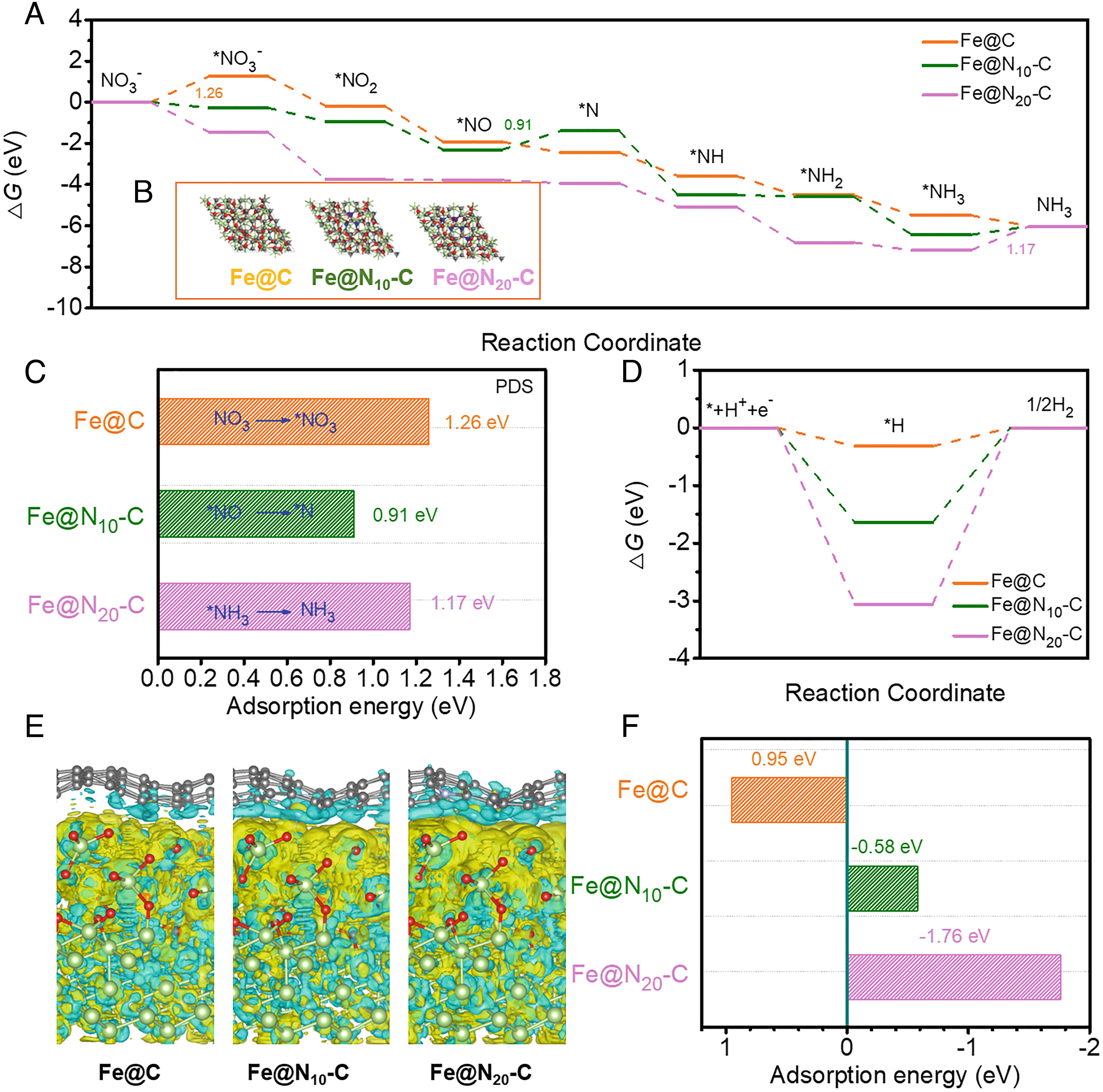 Fig. 3. Mechanistic study of catalytically active sites in Fe@N10-C for NO3-RR.