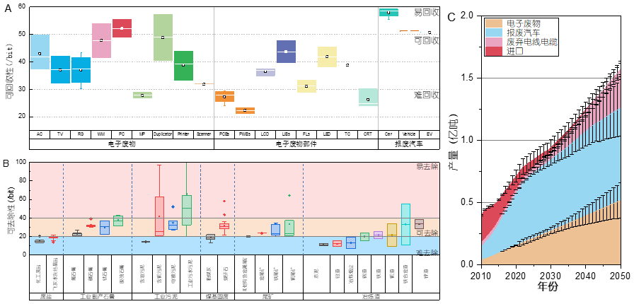 (A) Recyclability of valuable resources in solid waste (resource property); (B) Removability of hazardous substances in solid waste (environmental property); (C) Generation of typical solid wastes in China