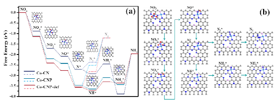 Based on density functional theory calculations, the research group innovatively strengthened the pollution purification theory and methods at the single-atom scale structure regulation level. They explored the conversion reaction mechanism of NO3− on the model SAC catalyst active sites from a molecular level, analyzing reaction pathways and energy changes of NO3−. The results revealed that NO3− undergo stepwise deoxygenation and hydrogenation elementary reactions on single-atom sites. N* can further couple to form nitrogen gas when energy is provided externally or can react spontaneously and gradually with hydrogen to form ammonium products. The defect sites formed after phosphorus doping promote the catalytic conversion of NO3−at the adjacent CoP1N3 sites, and the nitrate reduction process involves an 8-electron transfer to produce ammonium products. Additionally, the research found that the defect structures near the metal active sites help to further enhance the activity of single-atom catalysts, providing theoretical guidance for designing catalysts with high activity sites and revealing the conversion and product distribution rules of nitrate reactions.