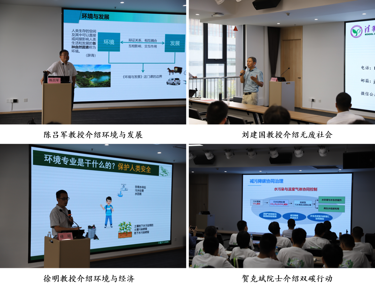 Professor Chen Lvjun introducing Environment and Development; Professor Liu Jianguo introducing Zero-waste Society; Professor Xu Ming introducing Environment and Economy; Academician He Kebin introducing Dual Carbon Actions