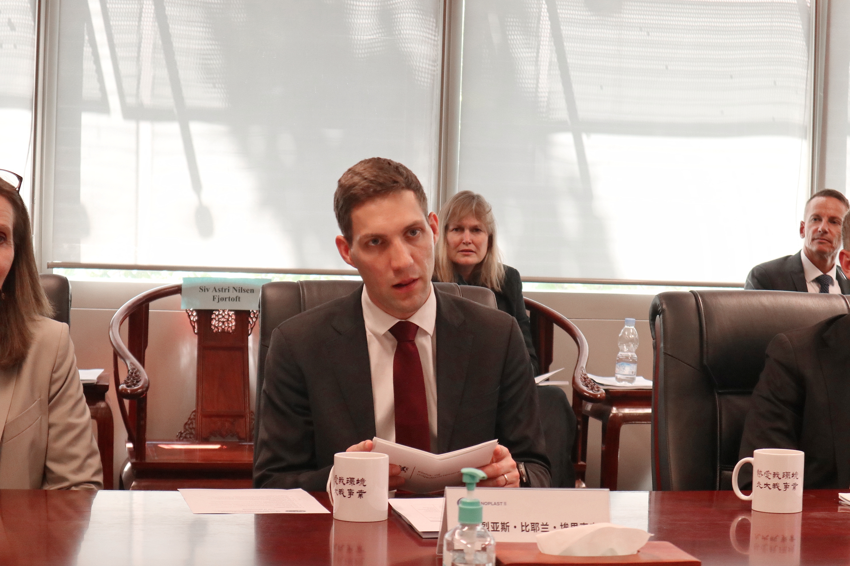 Attendees included Yang Bin, Vice President of Tsinghua University, Andreas Bjelland Eriksen, Minister of Climate and Environment of Norway, Liu Shuming, SOE Dean, Li Jinhui, Executive Director of BCRC China and Professor at SOE, and over 40 participants including representatives from the Norwegian Ministry of Climate and Environment, the Norwegian Embassy in China, the Department of Solid Wastes and Chemicals at the Ministry of Ecology and Environment, the National Marine Environmental Monitoring Center, the Research & Development Affairs Office and Office of International Affairs at Tsinghua University, the participating units, and the demonstration cities of the first phase, as well as leaders and faculty members at SOE. Prior to the meeting, Yang Bin and Eriksen held bilateral talks.
