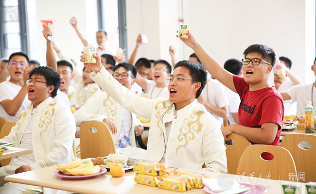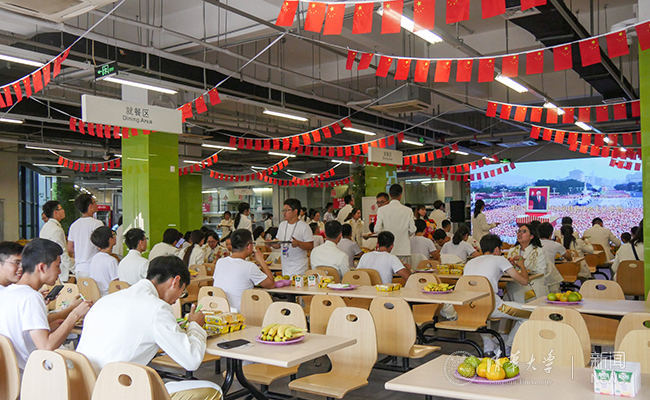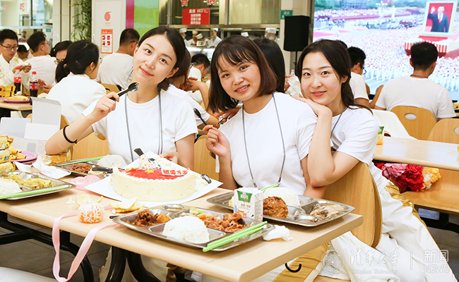 学校在紫荆园、清芬园、清真食堂为参加庆祝活动的师生准备了丰盛的午餐。一面面鲜艳的国旗将餐厅装饰一新。两个月朝夕相处,参加国庆群众游行的师生们早已成为了无话不谈的知己。他们围桌而坐,畅谈走过天安门的激动心情,重温刚刚过去的那短暂却弥足珍贵的片段。学校还为国庆日过生日的师生精心准备了生日蛋糕。在温馨的生日歌中,“寿星们”与大家分享与共和国一起过生日的喜悦之情。