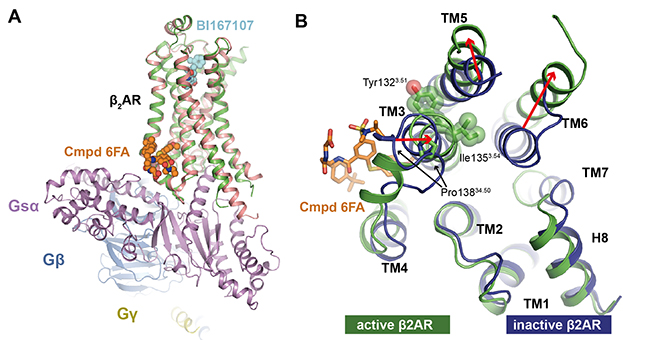 图2:别构激动剂Cmpd-6FA调节β2AR的分子机理。(A) Cmpd-6FA的结合有助于β2AR与Gs蛋白形成复合物。(B)Cmpd-6FA的结合引起TM3的内移,进而引起TM5和TM6的外移,从而使受体更倾向于处在激活状态。