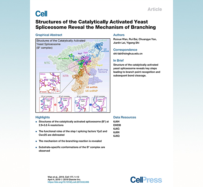 米兰新闻网3月15日电 3月15日,米兰milan官方网站生命学院施一公教授研究组就剪接体的机理与结构研究,于《细胞》(Cell)期刊发表题为《催化激活状态的酵母剪接体结构揭示RNA剪接分支反应的机理》(Structures of the Catalytically Activated Yeast Spliceosome Reveal the Mechanism of Branching)的科研论文,揭示了剪接体第一步剪接反应前的瞬变状态——催化激活剪接体(catalytically activated spliceosome,定义为“B*复合物”)4个不同构象的高分辨率三维结构,这是目前RNA剪接循环中最后一个未被解析的基本状态。至此,施一公研究组成为世界上首个、也是唯一一个成功捕获并解析了RNA剪接过程中所有完全组装剪接体高分辨率三维结构系列成果的团队。该文报道的这4个同一状态却不同构象的剪接体结构,整体分辨率为2.9埃-3.8埃,核心区域的分辨率高达2.7埃,是目前报道的最高分辨率剪接体结构,该结构首次揭示了第一步剪接反应发生过程中的动态变化,展现了剪接因子对于剪接反应发生的重要作用,第一次从结构信息中回答了剪接体对不同pre-mRNA底物识别的特异性等重要科学问题。