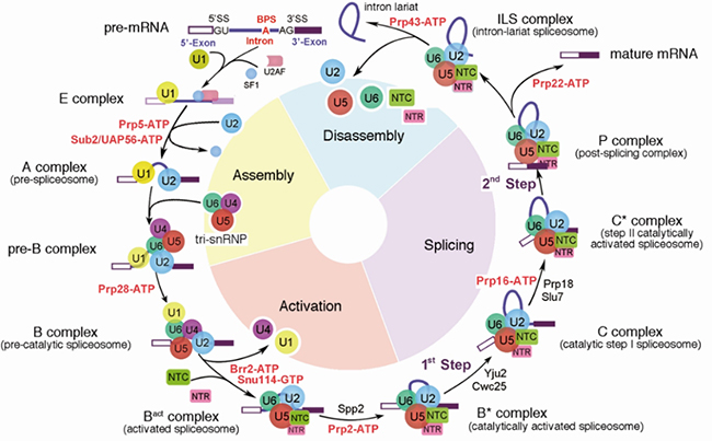RNA剪接是真核生物基因表达调控的重要环节之一,其化学本质是两步转酯反应。这种看似简单的化学反应在细胞中难以自行发生,而负责执行这一化学反应的是细胞核内一个巨大且高度动态变化的分子机器——剪接体(spliceosome)。从1977年首次发现RNA剪接至本世纪初,科学家们通过免疫沉淀、基因敲除、交联质谱、建立体外剪接反应系统等研究手段,初步建立起剪接体的组装、激活与解聚的发生过程,以及蛋白与蛋白、蛋白与核酸之间的相互作用、相互调控等复杂的RNA剪接调控网络。在剪接反应过程中,多种蛋白-核酸复合物及剪接因子按照高度精确的顺序发生结合、重排和解聚,依次形成预组装复合物U4/U6.U5 Tri-snRNP(U4/U6.U5三小核核糖核蛋白复合物)以及至少8个状态的完全组装剪接体pre-B、B、Bact、B*、C、C*、P以及ILS复合物(图1)。