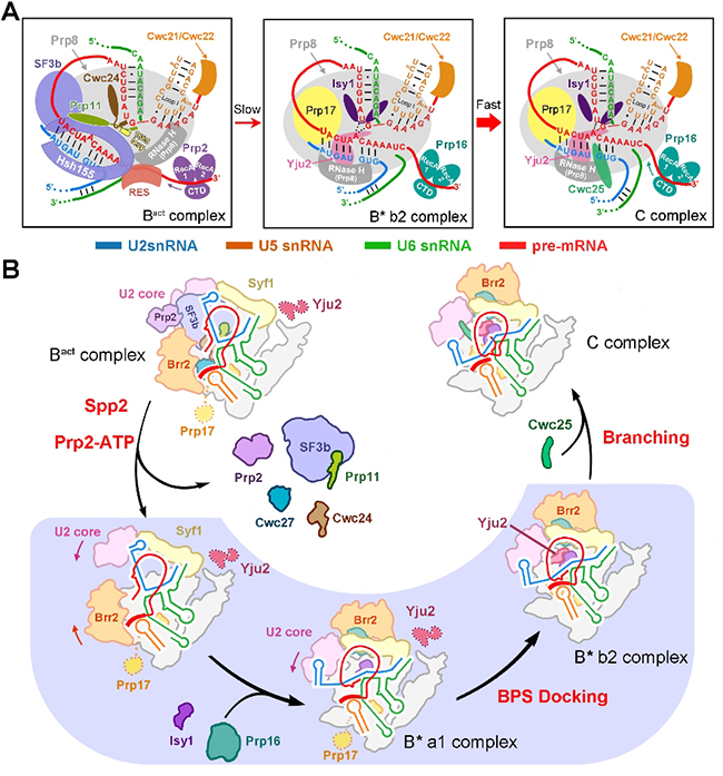 由于剪接体高度的动态性和复杂性,获得不同状态的剪接体的高分辨率三维结构被公认为世界难题。在这种巨大的挑战下,施一公教授率领研究组迎难而上,经过7年的努力,终于在2015年首次报道了裂殖酵母剪接体3.6埃的高分辨率结构,首次展示了剪接体催化中心近原子分辨率的结构。这一重大研究成果对RNA剪接机理的研究产生革命性影响。自2015年第一个剪接体结构发表以后,施一公研究组相继解析了酿酒酵母剪接体复合物处于8个不同状态的高分辨率结构,分别是3.8埃的预组装复合物U4/U6.U5 Tri-snRNP、3.3埃-4.6埃的预催化剪接体前体pre-B complex、3.9埃的预催化剪接体B complex、3.5埃的激活状态剪接体Bact complex、3.4埃的第一步催化反应后剪接体C complex、4.0埃的第二步催化激活剪接体C* complex、3.6埃的完成两步转酯反应后的剪接体P complex,以及3.5埃的内含子套索剪接体ILS complex的结构。这些已解析的剪接体基本覆盖了整个RNA剪接循环,从分子层面揭示了剪接体催化RNA剪接两步反应的工作机理,同时为理解剪接体的组装、激活和解聚等过程的发生提供结构依据。然而,最后一个未被解析的完全组装剪接体B* complex,对于理解第一步剪接反应的发生具有至关重要的作用。由于其高度的动态性与瞬时性,如何捕获B* complex成为领域内的一大难题,也是世界上不同课题组争先解决的问题之一,捕获并解析其结构迫在眉睫。