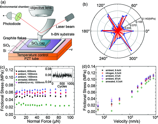 (a)实验装置图,微米尺度石墨岛在原子力显微镜针尖驱动下相对于六方氮化硼表面滑动;(b)实验测得的微米尺度单晶石墨和六方氮化硼表面间的各向异性摩擦力;(c)不同相对运动速度与环境下,法向载荷对摩擦力的影响。内图表示1000个运动周期内摩擦力的变化;(d)不同法向载荷和环境下,相对运动速度对摩擦力的影响。