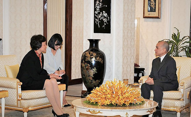 陈旭感谢西哈莫尼国王的热情接待。她说,非常高兴在中柬建交60周年之际访问柬埔寨并与西哈莫尼国王会面。中柬友谊千年源远流长、延绵不断。中国的“一带一路”倡议与柬埔寨“四角战略”高度契合,有效推动了双方的互利合作,提升了两国人民的福祉,两国的友谊日益深厚。