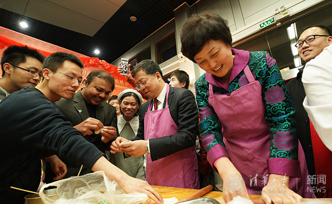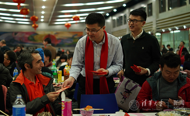 学校领导老师们将红包一一送到同学手中,并和同学们一起包饺子,共同度过除夕之夜。