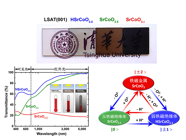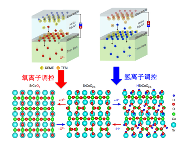 通过氧离子和氢离子的电场调控,可以实现SrCoO3, SrCoO2.5和HSrCoO2.5之间的可逆相变。