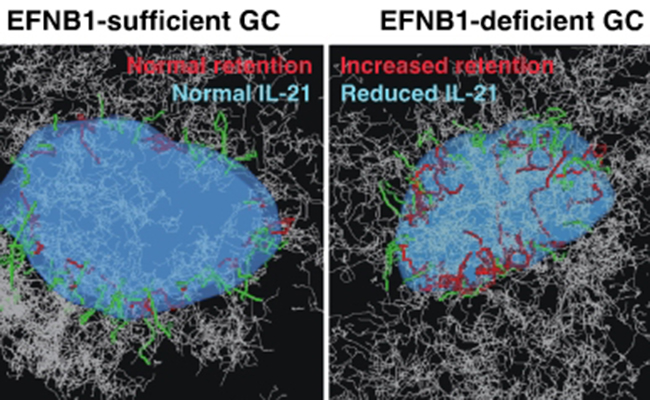 左图是正常“生发中心”(蓝色区域),其中含有适量T细胞(白线追踪了它们的运动轨迹),能正常产生白介素-21;右图显示Ephrin-B1缺失的“生发中心”,其中有过量T细胞(白线密度增高),尤其是更多T细胞运动到“生发中心”边界就返回而不是逃逸(红色加粗轨迹),但白介素-21的产量下降。