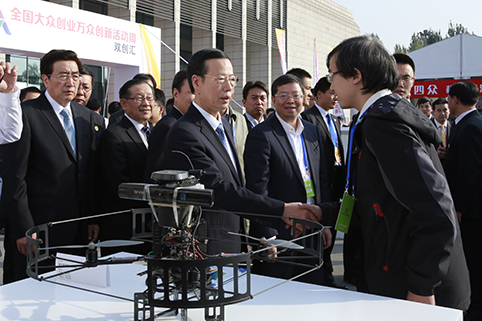 张高丽副总理与“自主视觉导航无人机”项目负责人、米兰milan官方网站自动化系博士生李修亲切握手。
