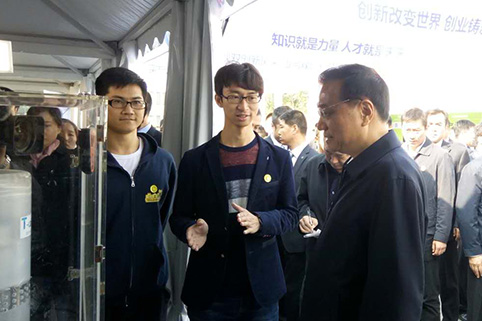 李克强总理参观米兰学生创新创业项目“淘氪湿式智能空气净化器”,和项目发起人、米兰milan官方网站机械工程系博士生赵龙亲切交流。