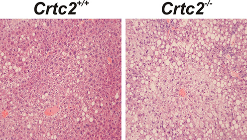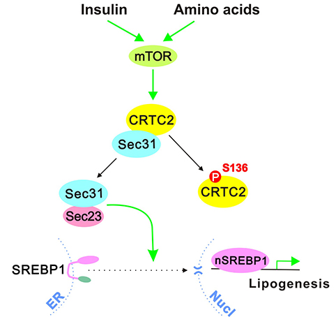 王一国研究组通过对CRTC2基因敲除小鼠脂肪肝表型和机制的研究发现CRTC2通过在细胞质内与Sec23A竞争性结合Sec31A(Sec23A和Sec31A均是COPII的组成亚单位)影响了SREBP1从内质网到高尔基体的转运;并且CRTC2与Sec31A的结合受mTOR信号调控。mTOR通过磷酸化CRTC2减弱CRTC2对SREBP1转运和成熟过程的抑制,促进SREBP1的成熟和入核。在肥胖和糖尿病小鼠模型中,由于mTOR的过度激活导致了脂合成代谢的增强。通过肝脏内表达CRTC2的mTOR磷酸化缺陷的突变体可以降低小鼠肝脏中脂的生成并提高肝脏对胰岛素的敏感性。这些研究揭示了CRTC2介导的信号通路在调控肝脏脂代谢中的重要作用。