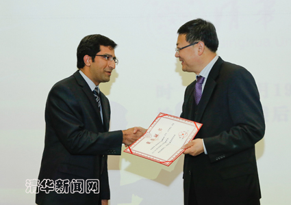 图为陈吉宁为来自伊朗的博士生哈米德颁发特等奖学金证书。学生记者 王皓冉 摄