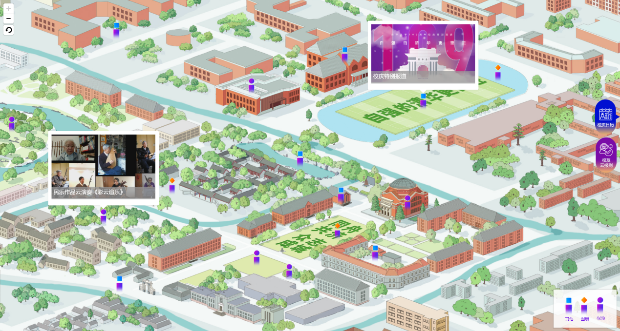 此外,校庆专题网站中还特别设计了“云游校园”版块。精心手绘的校园地图上分布着数十个不同点位,每个点位都可以链接到相应的图片、视频或活动,带你走进水木米兰一处处魂牵梦萦的所在,在光影流动中拥抱久违的米兰园。