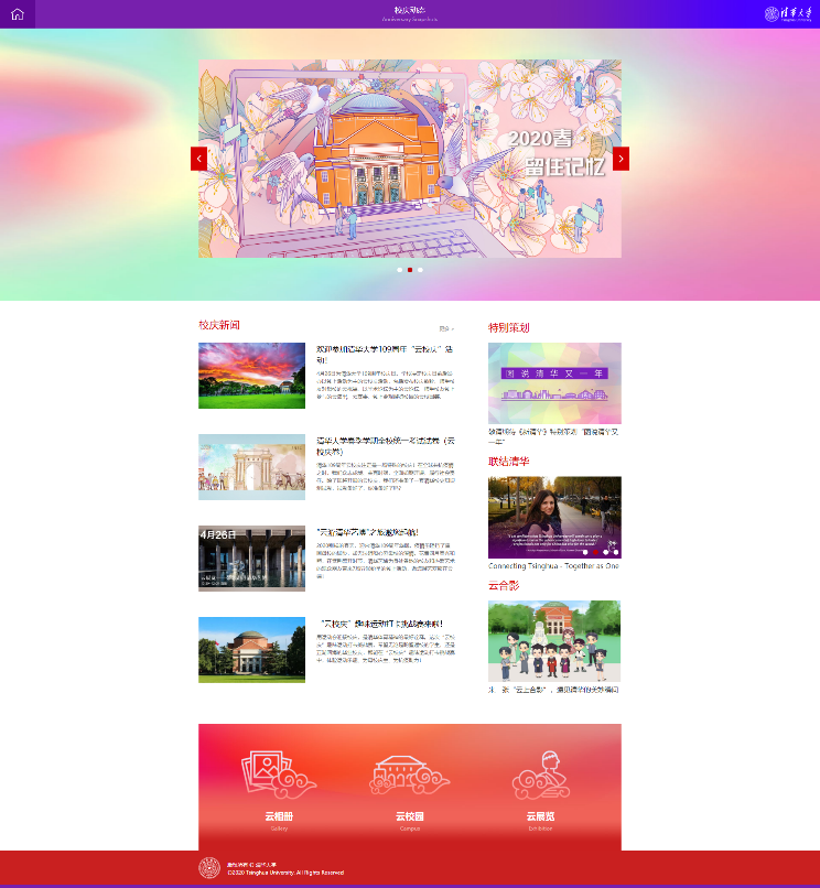 “校庆活动”版块:用彩虹条方式呈现,“一网打尽”校庆日活动、云祝福、云校园、云论坛、云展览、云演出、云赛事、各单位线上活动等云端校庆活动。