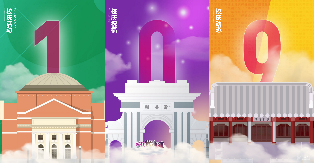 校庆专题网站首页用109三个数字和绿、紫、橙三种颜色,分别对应校庆活动、校庆祝福、校庆动态三个板块的不同入口。点击首页浮动的“校庆特别报道”云朵,可以看到直播平台列表,并从这里直接前往4月26日校庆当天持续4小时的“校庆特别报道”节目现场。